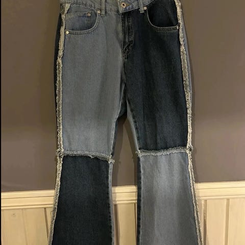 Warp patchwork flare pants i denim og beige tekstil💙🤎Superfete! Splitter nye - lange ben😍