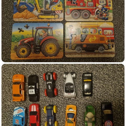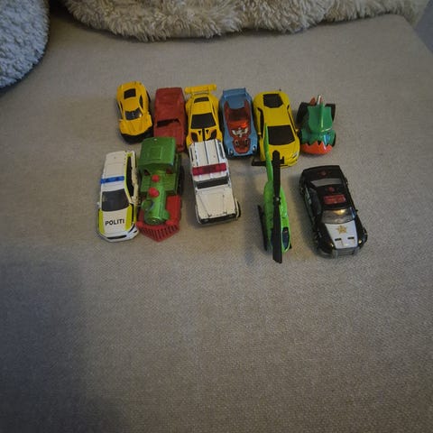 Diverse lekebiler i variert størrelse og tilstand.