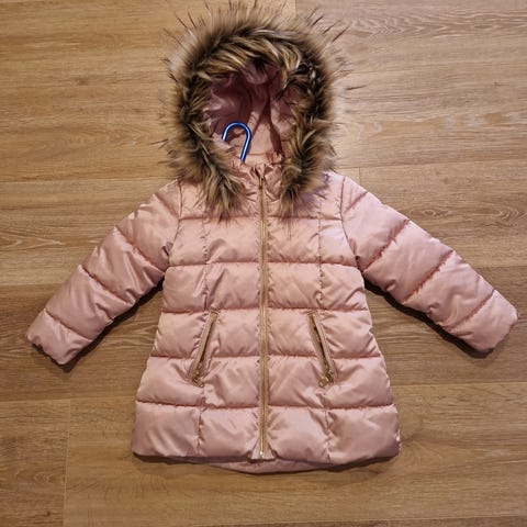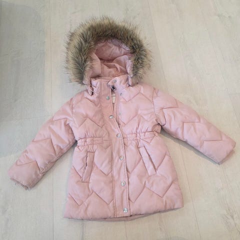 H&M jakke for jente i størrelse 116. Jakken er lilla og laget i polyester. Modellen er vattert med hette og avtagbar fuskepelskant. Den har glidelåslukking foran kombinert med trykknapper, samt lommer i sidene. Egnet som ytterjakke i kjøligere vær.
