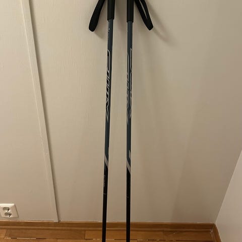 Swix skistaver i hvit og rosa farge. Stavene har håndtak med stropp og store trinser nederst.