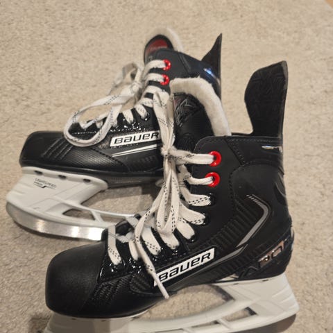 Bauer Performance ishockeyskøyter for barn i størrelse 36. Skøytene er i hovedsak svarte med lyse lisser og fôr. De har fastmontert stålskinne og leveres med avtakbare plastbeskyttere til skøytestålet. Egnet til ishockey og generell skøytebruk for barn som trenger en stabil og støttende skøyte på isen. Har blitt slipt så de er bruksklare.
