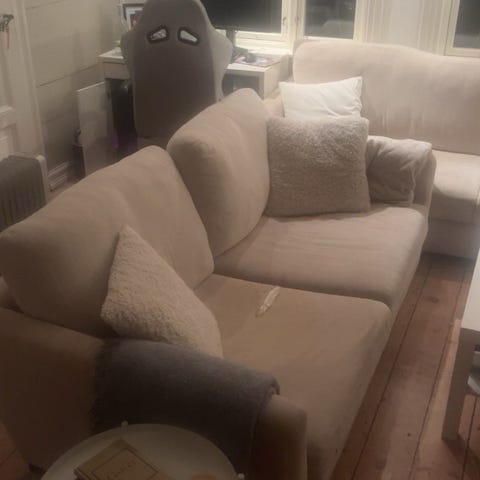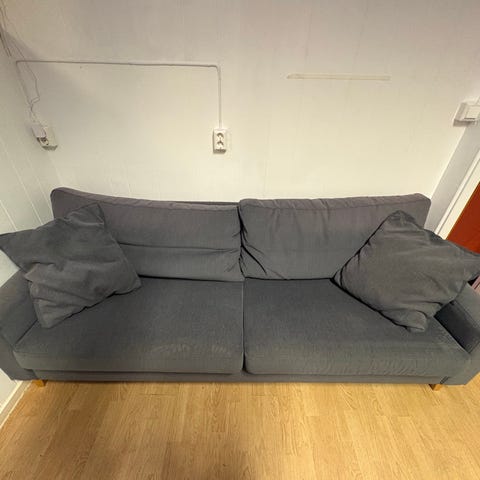 Søt og nett treseter rosa sofa i velour. Ukjent alder. Har litt slitasje på armlenene og noen få skjønnhetsfeil på baksiden langs søm. Putene er vendbare og ikke synlig slitt. Kommer fra hjem med katt, men er støvsugd. Må hentes på Laksevåg. Er veldig lett å bære. Jeg kan hjelpe med å bære ut.