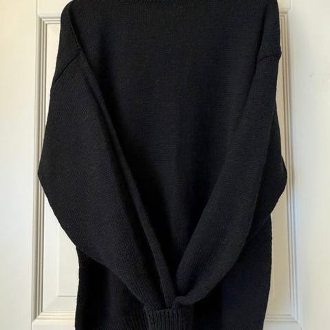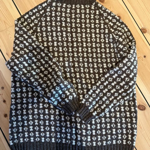 Ny håndlaget strikket genser unisex. Overvidden 132 cm, lengde 70 cm, armlengde fra underarmhulen 56 cm. Strikket i Karisma fra sandes garn. 100% ull, klorerikke.