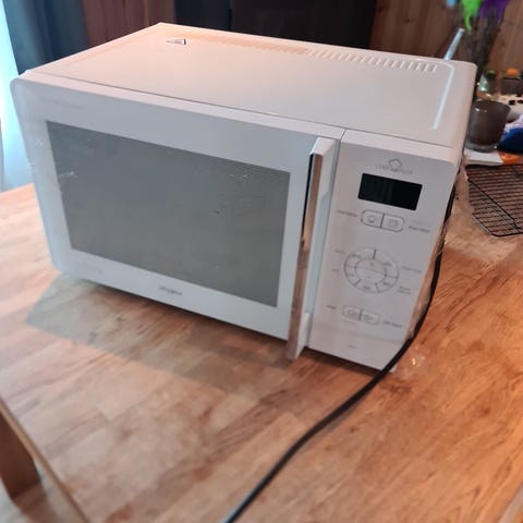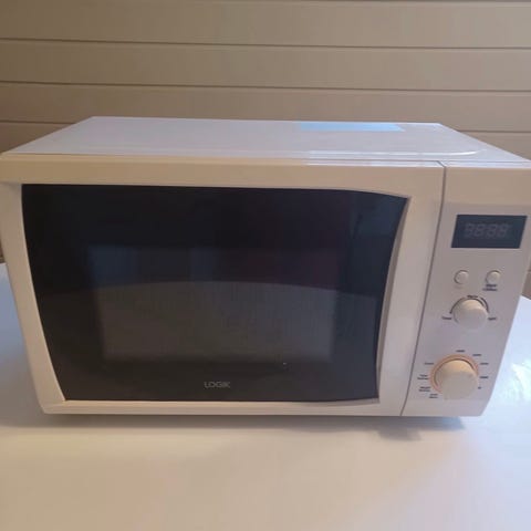 Logik mikrobølgeovn i hvit utførelse. Modellen har front med digitalt display og betjeningspanel med trykknapper og dreiehjul for innstilling av tid, vekt og automatiske programmer. Døren har stort vindu i mørkt glass. Leveres med standard strømkabel med jordet støpsel. Passer til oppvarming, tining og enkel tilberedning av mat på kjøkkenet.