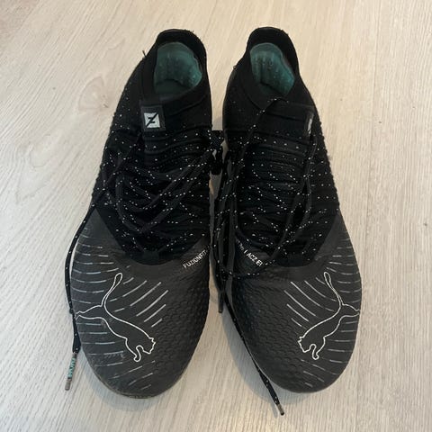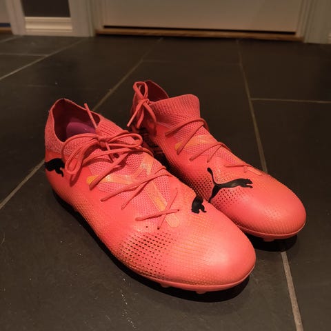 Puma fotballsko med knotter i svart og rosa mønster. Brukt en gang. Yttersåle med faste knotter som passer til spill på gress eller kunstgress. Overdelen er i syntetisk materiale som er lett å rengjøre. str. 36
