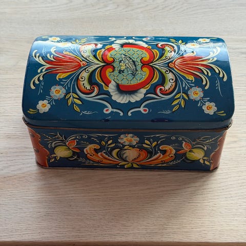 Gammel kakeboks fra 60-tallet. Fin blåfarge dekorert med småfugler. Selges billig pga skaden i ene hjørnet, se bilde. Størrelse 23,5 x 23,5 x 11 cm. Kan sendes med PostNord for kr 69,-.