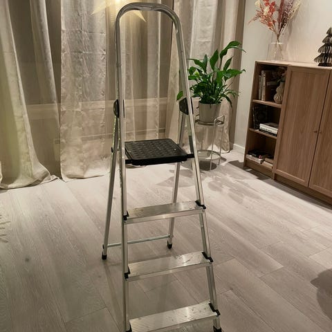 Trappestige i aluminium med 6 trinn. Stigen har bøyle øverst for støtte og stabilitet. Egnet til bruk innendørs og utendørs der det er behov for ekstra arbeidshøyde, for eksempel ved maling, vedlikehold eller annet arbeid i høyden.