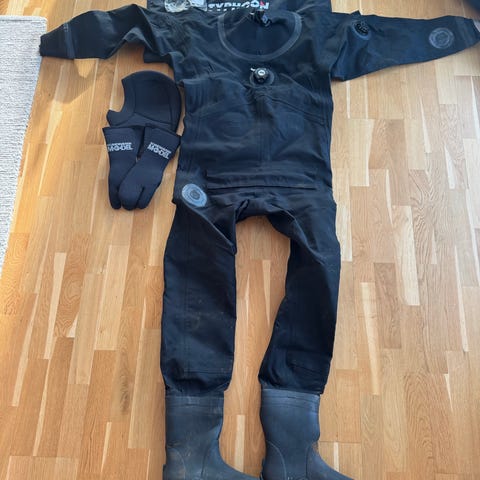 Det følger med innerhansker (ikke brukt), ekstra mansjetter, samt bag med Scandinavian Diving Company-logo.