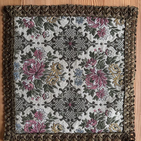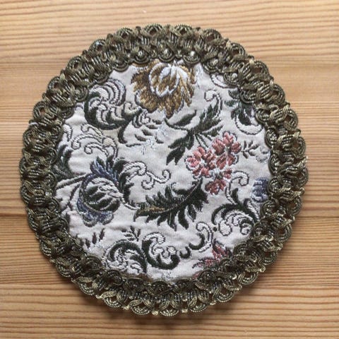 Liten brikke med et blomstermønster og en brodert kant, brukes som interiørdekorasjon.