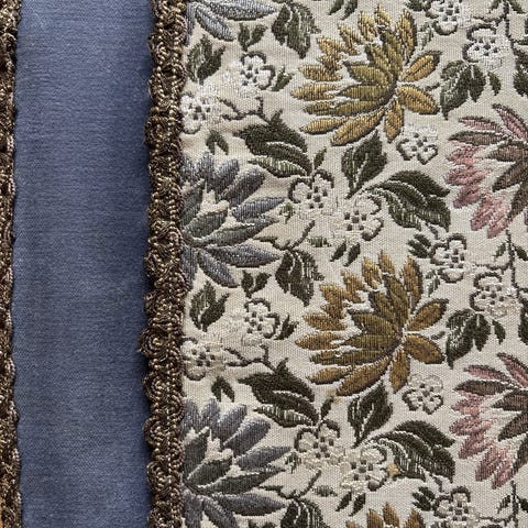 I fløyel med gullkant og blomsterdesign.