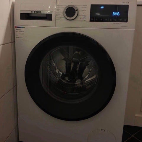 Bosch frontmatet vaskemaskin i hvit utførelse. Maskinen har frontåpning med rund dør og oversiktlig betjeningspanel med dreiehjul og display. Egnet for plassering på bad eller vaskerom med tilkobling til vann og avløp bak på maskinen. Passer til vanlig husholdningsbruk for vask av klær og tekstiler. Nærmere tekniske spesifikasjoner som kapasitet, energiklasse og modellbetegnelse bør sjekkes på typeskiltet på maskinen.