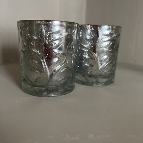 2 stk dekorativ, hengende lysestake laget av metalltråd eller lignende materiale, utsmykket med små krystaller.