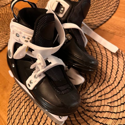 Barneskøyter i justerbar størrelse. Modellen har kombinasjon av lisser og justerbar stropp for god tilpasning rundt foten. Overdelen er i syntetisk materiale med hvite og blå detaljer, og skøytene har polstret innside for økt komfort. Passer til generell skøytebruk for barn.