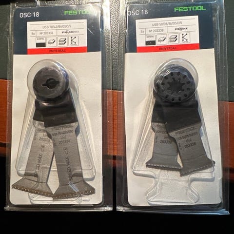 Selger et helt nytt og ubrukt Festool Multi-Material Set (sett 3/6) med tre originale sagblad. Kun åpnet for bilder – aldri montert eller brukt.