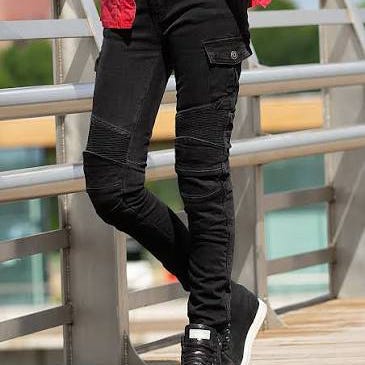 Kul MC bukse til dame i svart denim med knebeskyttere.