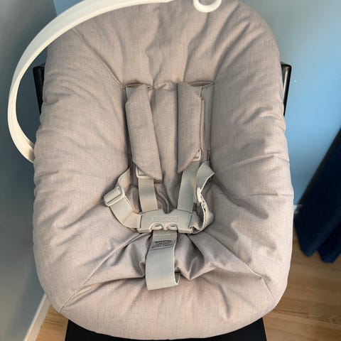 Tripp Trapp® Newborn Set med Leketøyhenger, i grått trekk. Slik at stolen kan brukes fra nyfødt til 9 kg.