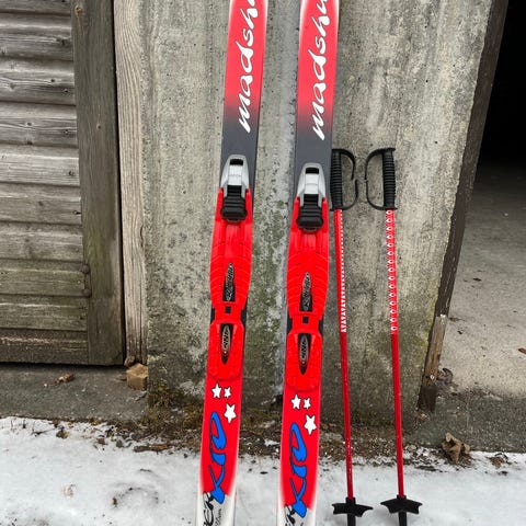 Ski: Madshus Superkid, klassiske langrennsski for barn. Skiene har integrerte bindinger (Rottefella NNN-type) montert. Fargekombinasjon hovedsakelig hvit, rød og gul med Madshus-logo langs skiene.