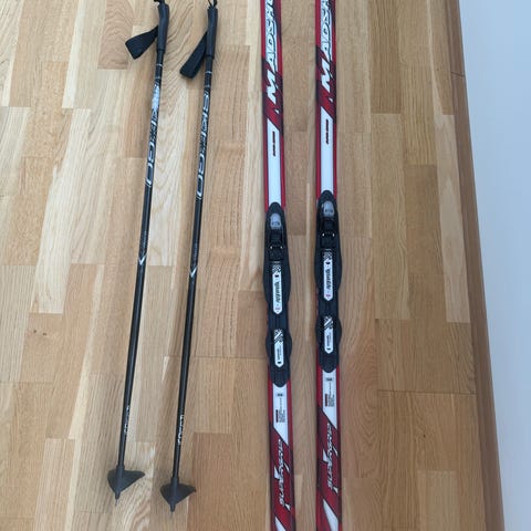 Passer til bruk i preparerte langrennsløyper. Nøyaktig lengde på ski og staver fremgår ikke tydelig av bildene og bør eventuelt måles av selger.
