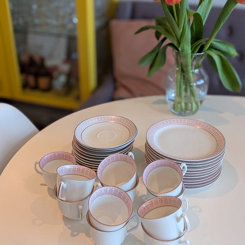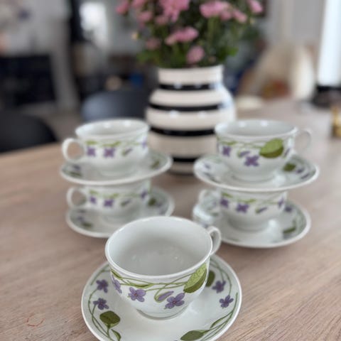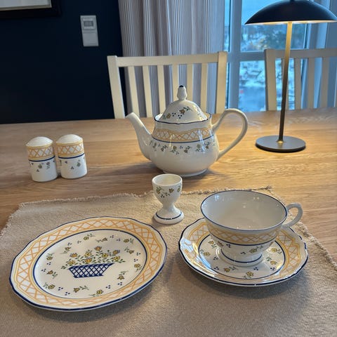 Flott frokostservise i porselen fra Villeroy og Boch sitt servise «Riviera». Med vakkert blomster-mønster. Komplett servise til 4 personer (kopp, tefat og asjett) + ekstra tefat og asjett. Koppene er i stor størrelse (tekopper). I veldig pen bruktstand, men bruksmerker forekommer. Selges samlet.