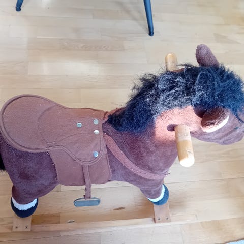 Klassisk gyngehest i tre og plysj selges. Solid konstruksjon og står stødig. Fin til lek og som dekor på barnerom.