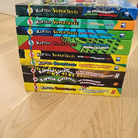 Sett med fire illustrerte barnebøker i Kaptein Supertruse-serien på norsk. Innbundne bøker med fargerike omslag og tegneserielignende illustrasjoner. Bøkene følger Kaptein Supertruse og ulike humoristiske eventyr med robotter, doer, romvesener og professor Bæsjebleie.