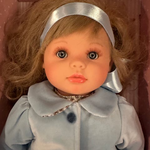 Dukke ca 60 cm. Håndlaget "Elsa-kjole". Har bodd hos en bestemor, nå er barnebarnet blitt for stor, så kanskje noen andre kan få glede av dukka. Meget pent brukt.
