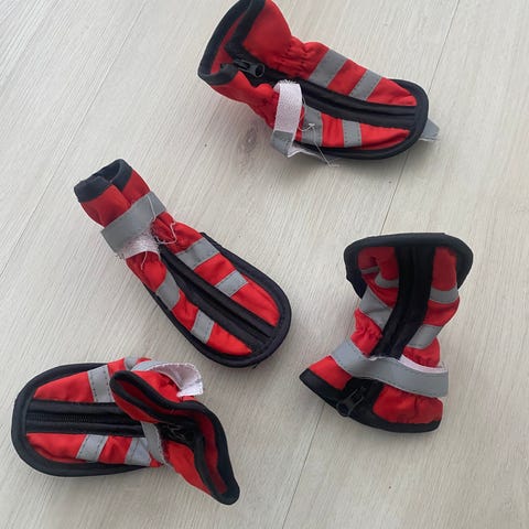 Blå hundesko med hvitt, mykt fôr i størrelse S. Skoene har lengde på ca. 4 cm og bredde på ca. 3,5 cm. De er egnet for små hunder og kan brukes for å beskytte potene mot kaldt underlag eller skitt. Skoene har oppbrettbar kant og utforming som gjør dem enkle å ta av og på hundens poter.