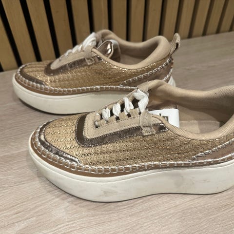 Steve Madden sneakers i størrelse 36. Modellen er i en lys beige farge med vevet tekstiloverdel og kraftig, lys såle. Lukkes med lisser og har hempe bak for enklere av- og påtaking. Nøytral farge som passer til hverdagsbruk og fritid. Aldri brukt da de ble akkurat litt for små for meg (jeg bruker vanligvis 36,5).