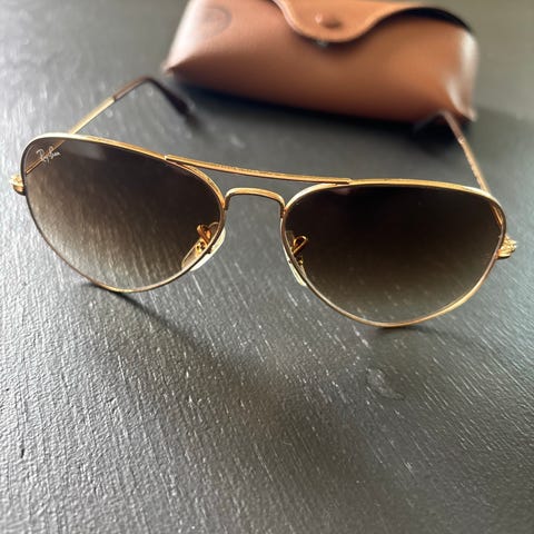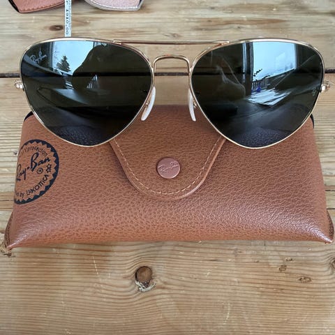 Ray-Ban Aviator solbriller for unisex. Klassisk pilotform med sølvfarget metallinnfatning og mørke glass. Leveres med originalt Ray-Ban-etui som vist på bildene. Passer til både hverdag og bruk i sterkt lys. Nøytral stil som kan brukes av både menn og kvinner.
