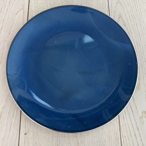 Tallerken i sort porselen/ glassaktig med en diameter på omtrent 26 cm, målt med målebånd på bildene. Tallerkenen har en lett forhøyet kant og en glatt, blank overflate. Egner seg som middagstallerken eller serveringstallerken. Undersiden har en enkel bunnring for stabilitet på bordflaten.