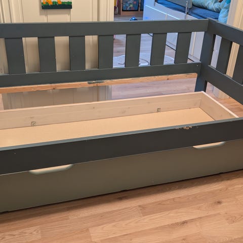 Vi har brukt denne som et ekstraledd til en vanlig seng, for å kunne samsove med et lite barn. Den er lett i vekt og perfekt til barn helt opp i 8/9-årsalderen. Den har vært ligget lite i, men fordi den har blitt lekt i på dagtid, skriver vi «godt brukt». Det har ikke vært noen «uhell» i senga, men madrassen har likevel noen svake flekker. Alt er nyvasket. De gule flekkene på ramma er kvist som har trengt gjennom hvitmalingen.