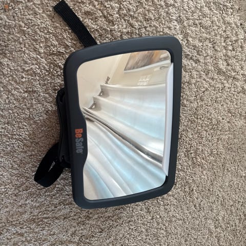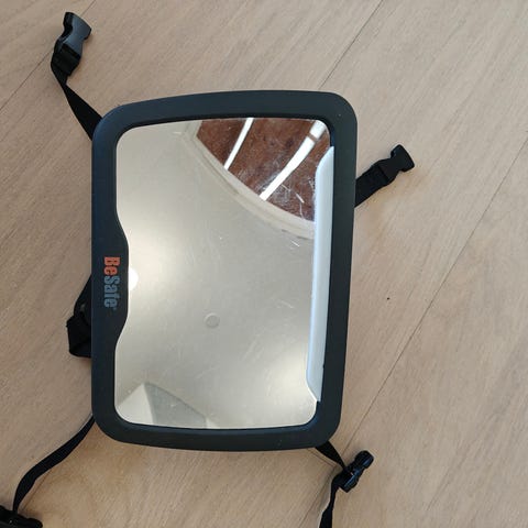 BeSafe bilspeil med festestropp. Rundt speil beregnet for montering i bil, slik at fører kan se barn i bakovervendt bilstol. Speilet har justerbar stropp for feste til bilens nakkestøtte eller annet egnet punkt i bilen. Egnet for bruk sammen med bakovervendte barneseter.