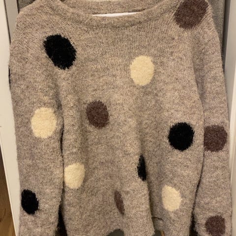 Myk, varm og god beige genser med hvitt hjerte både foran og bak.