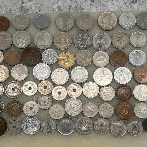 Blandet parti utenlandske mynter i ulike størrelser, valører og metaller. Myntene ser ut til å komme fra flere forskjellige land og tidsperioder, og inkluderer både hullmynter og hele mynter. Egner seg for den som samler på mynter eller ønsker et utvalg mynter til sortering og gjennomgang. Antall, årstall og opprinnelsesland varierer innen partiet.