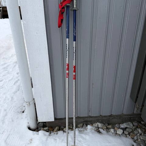 Slalomstaver i hvitt, svart og sølv. Lengde 105 cm. Staver med ergonomiske håndtak og håndstropper for bedre grep.