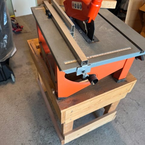 Elektrisk bordsag med integrert stativ. Maskinen har justerbar saghøyde og mulighet for vinkelsnitt via tiltbar sagblad-enhet. Bordet har anlegg og styreskinne for rette kutt. Egnet for kapping og ripping av trevirke og platematerialer i verksted eller garasje.