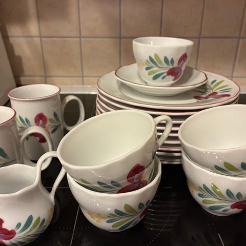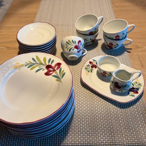 PP servise Marbella selges. 1 stk serveringsfat 34x30 cm. 6 stk tallerkener Ø: 27 cm. Må hentes, sender ikke.