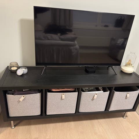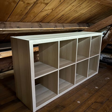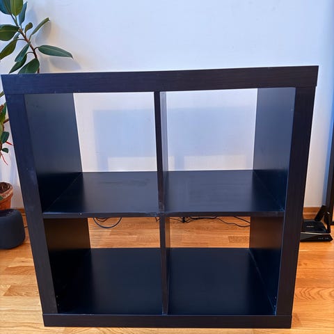 Reol som er noen år gammel, men i god stand. Den ligner på en IKEA selger nå som heter Kallax. Åtte små skuffer og fire skapdører. Ellers er den like fin på begge sider, og er stødig nok til å stå som romdeler. Tre bokser, to i tekstil og en i plast kan følge med om ønskelig. Mulig å parkere rett utenfor blokka. må bæres ned fra 3. etasje.