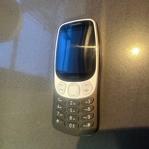 Nokia mobiltelefon med fysisk tastatur og liten skjerm. Telefonen har klassisk knappelayout med numeriske taster og funksjonstaster på forsiden. Baksiden har enkel høyttaleråpning. En USB-kabel følger med for lading eller tilkobling. Egnet til grunnleggende telefoni og SMS-bruk.
