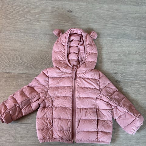 Cubus dunjakke i størrelse 86. Jakken er rosa og vattert med dunfyll. Den har glidelåslukking foran og hette. Passer som ytterjakke til kjøligere dager.