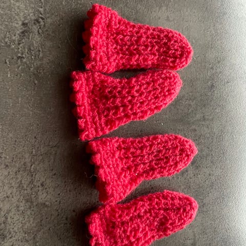 Hjemmestrikkede små ullsokker. Sokkene er ribbestrikket, laget i ullgarn. De er korte og smale, og passer til f.eks. chihuahua. Leveres som sett på fire sokker i samme utførelse og farge.