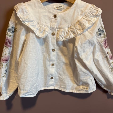 Newbie bluse til barn i størrelse 104 for jente. Blusen er i bomull med blomstrete mønster og lange ermer. Den har knappelukking foran og dekorativ krage med brodering.