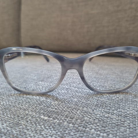 Max Mara brilleinnfatning for dame i blå plast. Rektangulære, lett avrundede glass med hel innfatning. Stenger i lys blå plast med metall-detaljer ved hengslene. Passer til innsliping av korrigerende brilleglass hos optiker. Egnet som hverdagsbrille eller lesebrille, avhengig av hvilke glass som settes inn. Per nå står det i glass for styrke minus 2.
