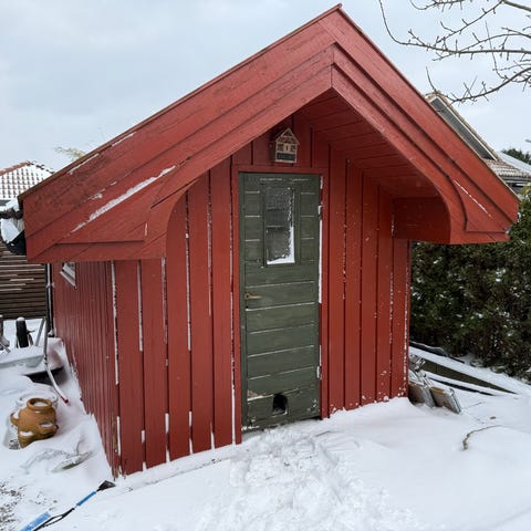 Gitt ett strøk oljebeis i fjor. Noen liter til medfølger for et nytt strøk til våren. Litt omramming av dør og hjørner gjenstår - bare kosearbeid!