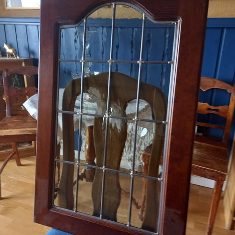 5 skapdører i antikk beiset eik selges til høystbydende. Dørene er tidligere benyttet på kjøkkeninnredning. 3 av dørene har en flott blyglass innfatning, mens 2 av dørene er heltre dører uten glass. Mål høyde 67,5 cm, bredde på 4 av dørene er 37 cm mens den ene døren er 47 cm bred. Blyglass innrammingen er av veldig god kvalitet, og er listet inn med samme materiale som er i dørene.