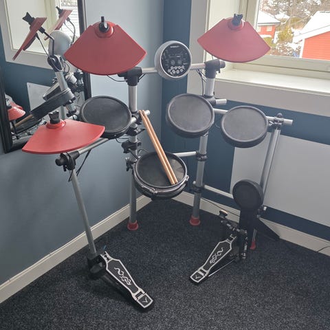 Selger et eldre elektrisk trommesett. Barna har bruktcdet kitt. Kan lett koble til headset med 3,5mm jack. Det fungerer ok, må strammes til og justeres litt.
