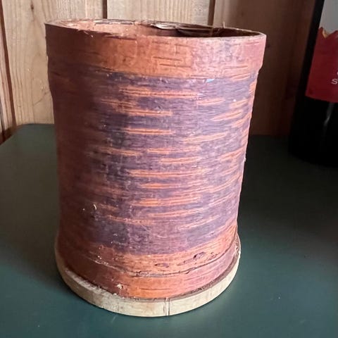 Håndlaget flettet ryggsekk i naturfarget tre-/barkmateriale.