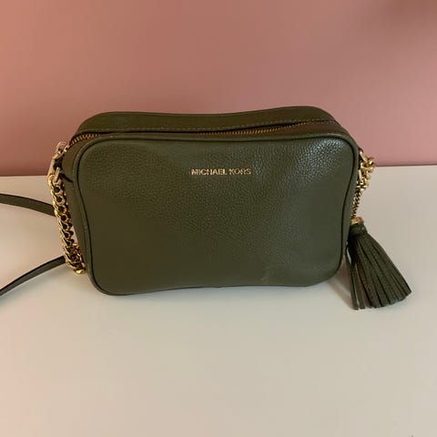 Innvendig har vesken lyst fôr med MK-logo, én hovedlomme, en glidelåslomme og flere mindre åpne lommer for organisering av småting. Lukkes med trykknapp under klaffen. Størrelsen passer til nødvendigheter som mobil, lommebok og nøkler.