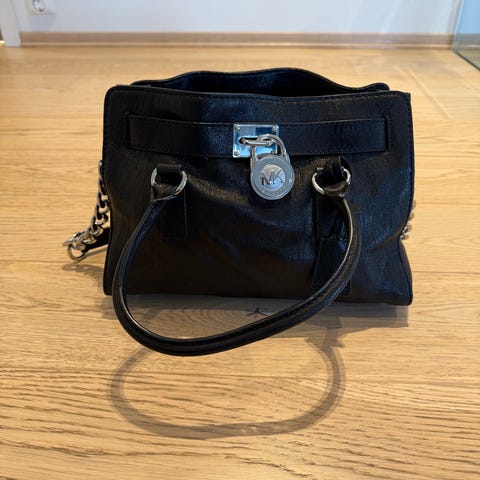 Vesken er laget i svart skinn med strukturert overflate. Den har kort skulderrem i skinn kombinert med lenkedetaljer i metall. På fronten er det en dekorativ lås med Michael Kors-logo i metall.