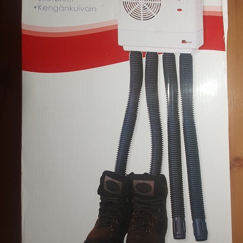 Kan tørke opptil fire sko eller støvler samtidig. Hvit plastkonstruksjon med ventilasjonsåpninger og løse tørkearmer.